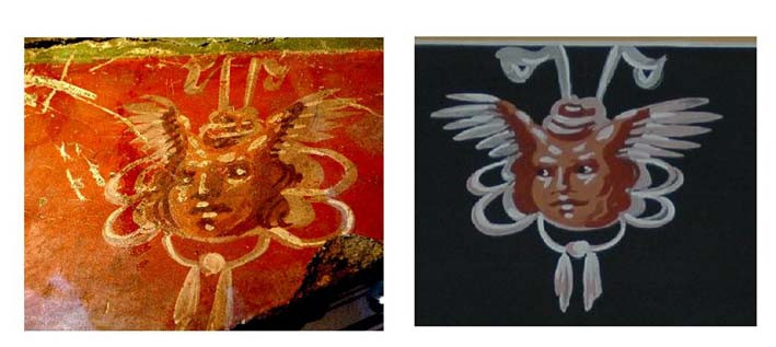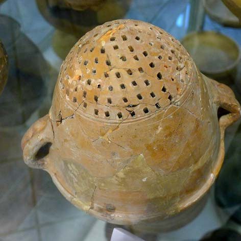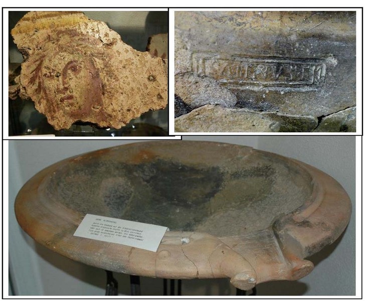 Unter den umfangreichen römischen Keramikwaren befand sich auch eine außergewöhnlich, 83 cm im Durchschnitt große Reibschüssel mit Ausguss, deren Rand mit dem Schriftzeichen „SATINUS F“, d. h. Satinus hat diese gemacht, signiert ist. Die Reibschüssel war ein häufig gebrauchtes römisches Küchengerät. Durch die Rauhung auf der Schüsselinnenwand konnten organische Stoffe mit Hilfe eines steinernen „Handschmeichlers“ gemahlen und zerkleinert oder zu Brei zerrieben werden. Ob Satinus auch die Person ist, die im Bild gemalt wurde, ist möglich, aber nicht erwiesen.