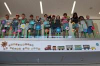In diesem Jahr fand eine Woche lang Projektunterricht in altersgemischten Gruppen statt. Die Kinder konnten weben (und unter anderem den dortigen Bauzaun verschönern), ein Gemeinschaftsbild nach Hundertwasser auf Leinwände zaubern, Geburtstagsthrone für jeden Klassenraum gestalten, Wünsche auf Stoffstreifen schreiben und an einem Wunschbaum aufhängen sowie unter Anleitung der Künstlerin Frau Bernadette Heeb-Klöckner töpfern. Gefördert wurde diese tolle Aktion durch das Land unter dem Motto „Jedem Kind seine Kunst“. Es war der Wunsch der ausgelagerten Schulgemeinschaft, etwas Bleibendes von der provisorischen Containerschule in den Schulneubau mitzunehmen. Und so entstand ein getöpferter Zug mit dem Schriftzug der Grundschule, ein Kunstwerk aus vielen einzelnen Elementen, das nun in seiner gesamten Schönheit die Empore im Eingangsbereich der neuen Schule verziert, auch wenn die kleinen Künstler von damals längst die Grundschule verlassen haben.